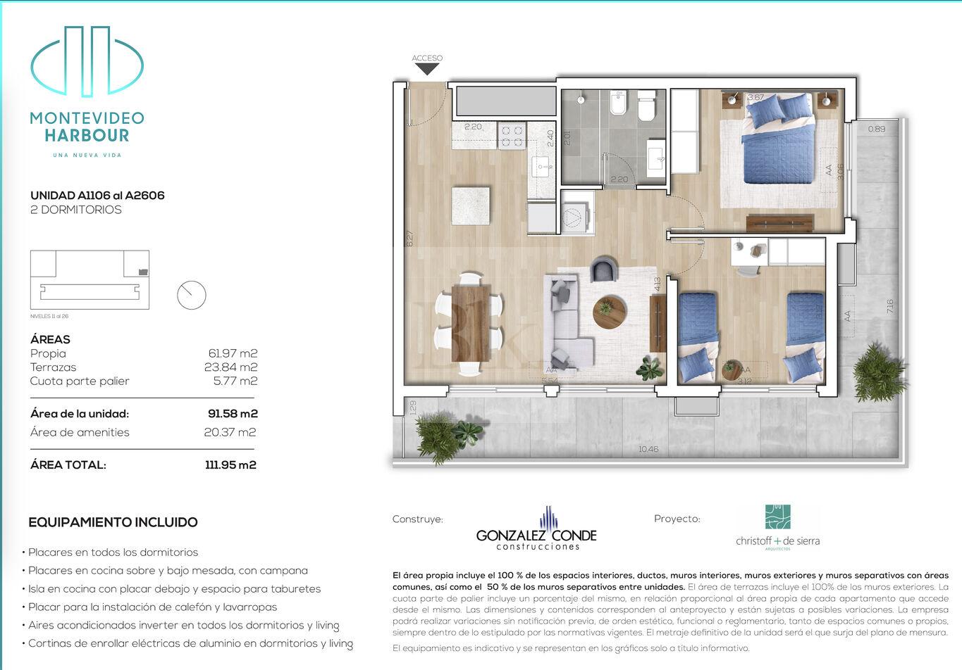 Beautiful 2-bedroom apartment for sale at Montevideo Harbour; high floor with views of the Bay.• Living and dining area with terrace overlooking the Bay
