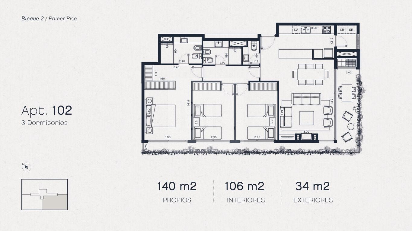 Bloque 2, Unidad 102 de 3 dormitorios en venta.